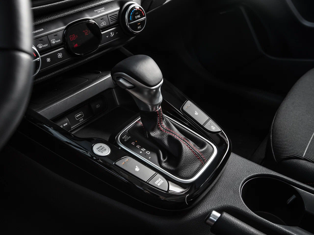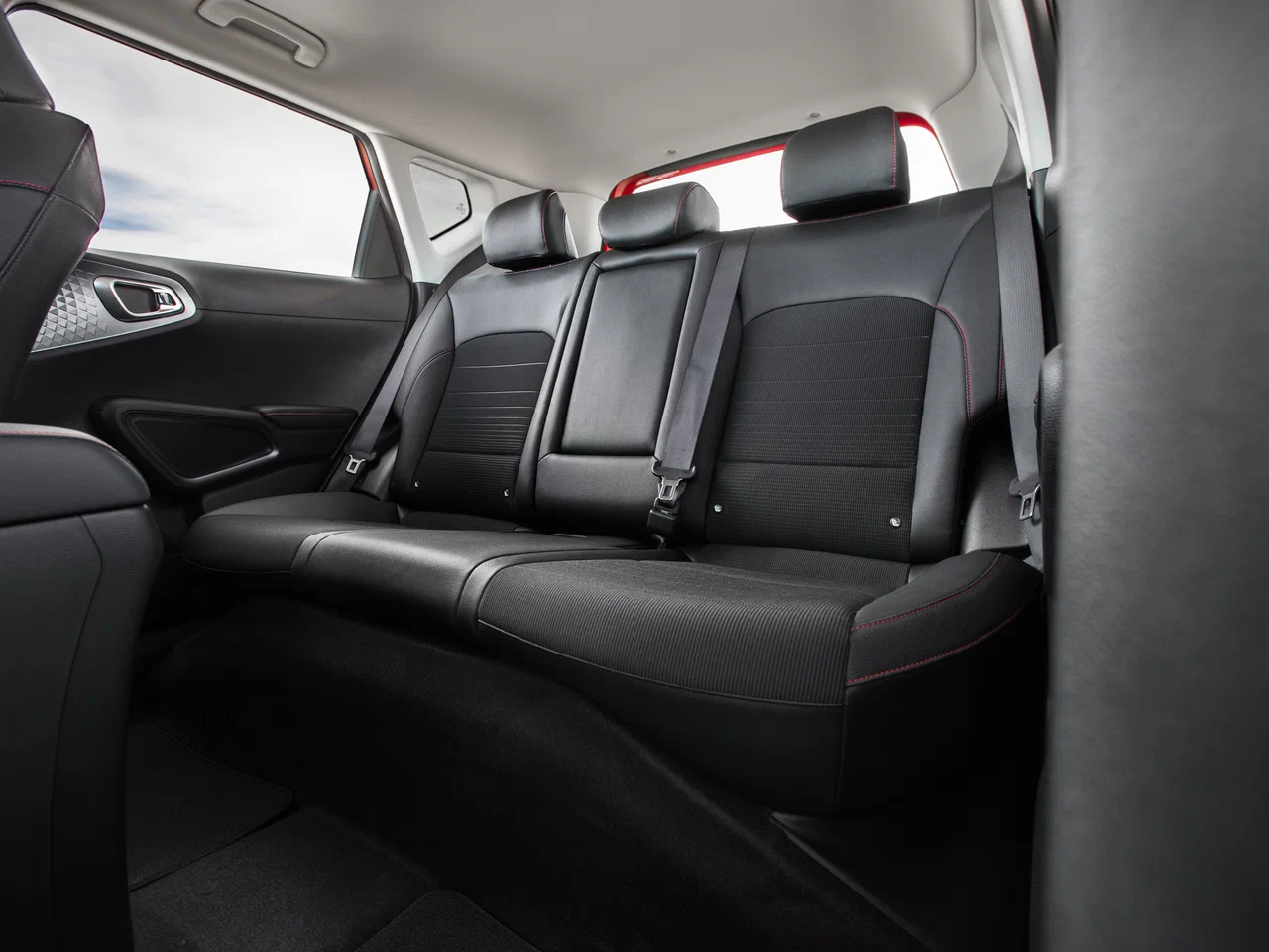 | Комбинированная отделка сидений из кожи и ткани с красной прострочкой |